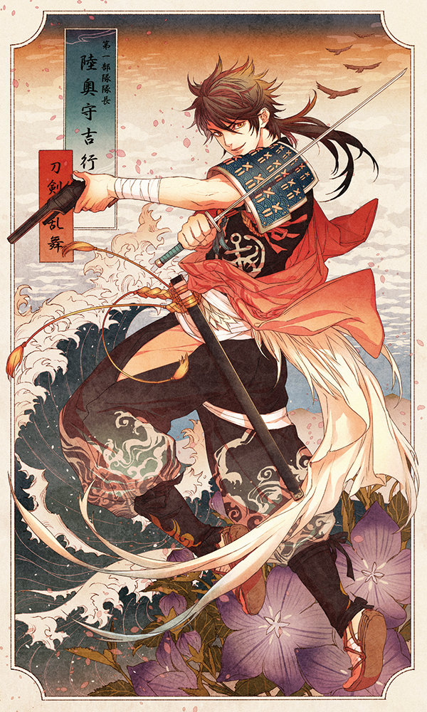 1boyanimalarmorarms upbandagesbirdblack hakamaborderbrown eyesbrown haircloudflowergunhakamahandgunholdingholding gunholding swordholding weaponigotejapanese armorjapanese clotheskoteleaflong hairlooking to the sidemale focusoceanplantponytailpurple flowerrevolversandalsscabbardsheathshoulder armorskysmilesoloswordwaterwavingweapon