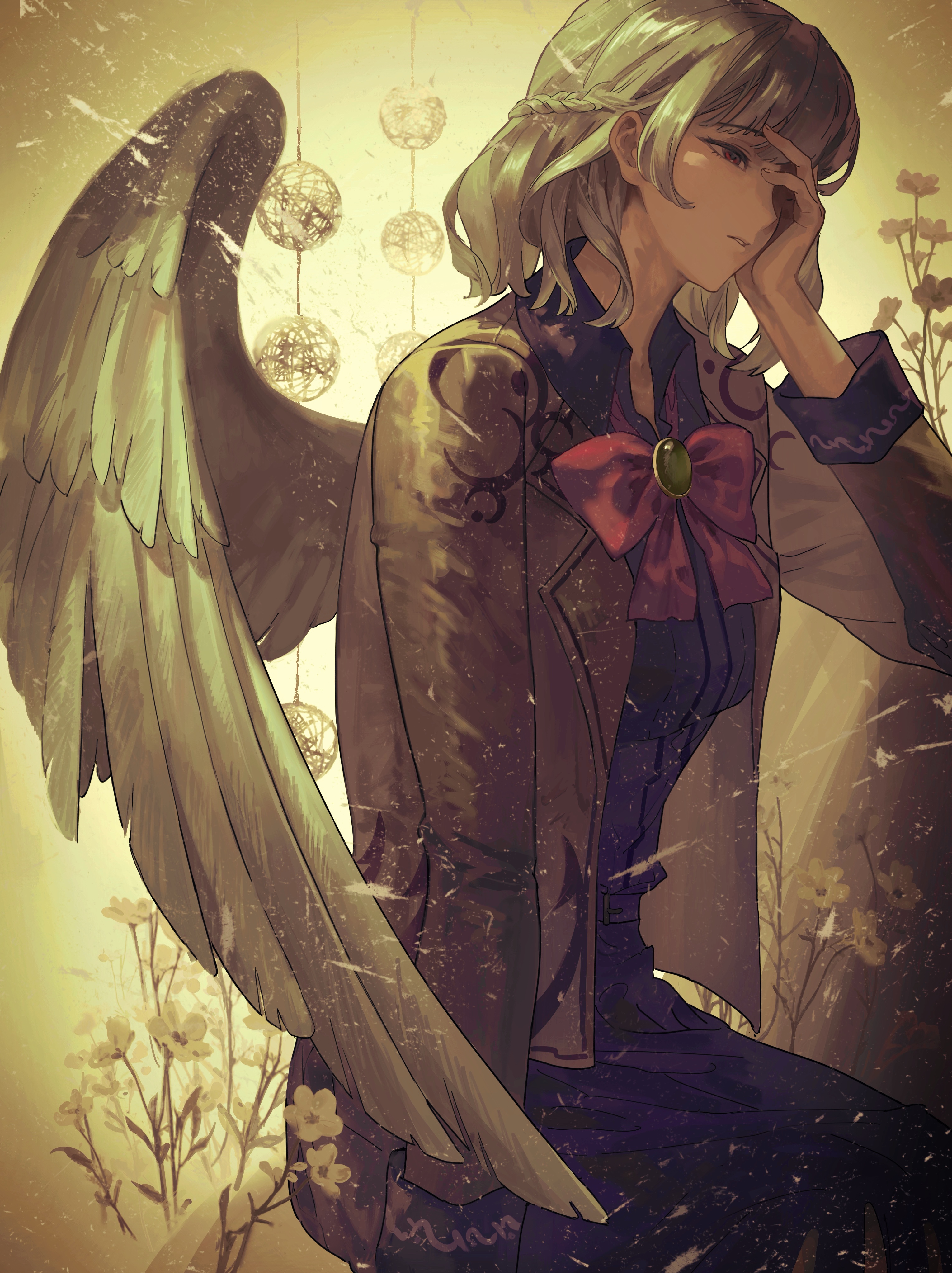 1girldressexpressionlessflowerfrom sidegradient backgroundhand on own facejacketlong sleeveslooking to the sidemedium hairparted lipspurple dressred eyessingle wingsoloteethwhite hairwhite jacketwhite wingswings