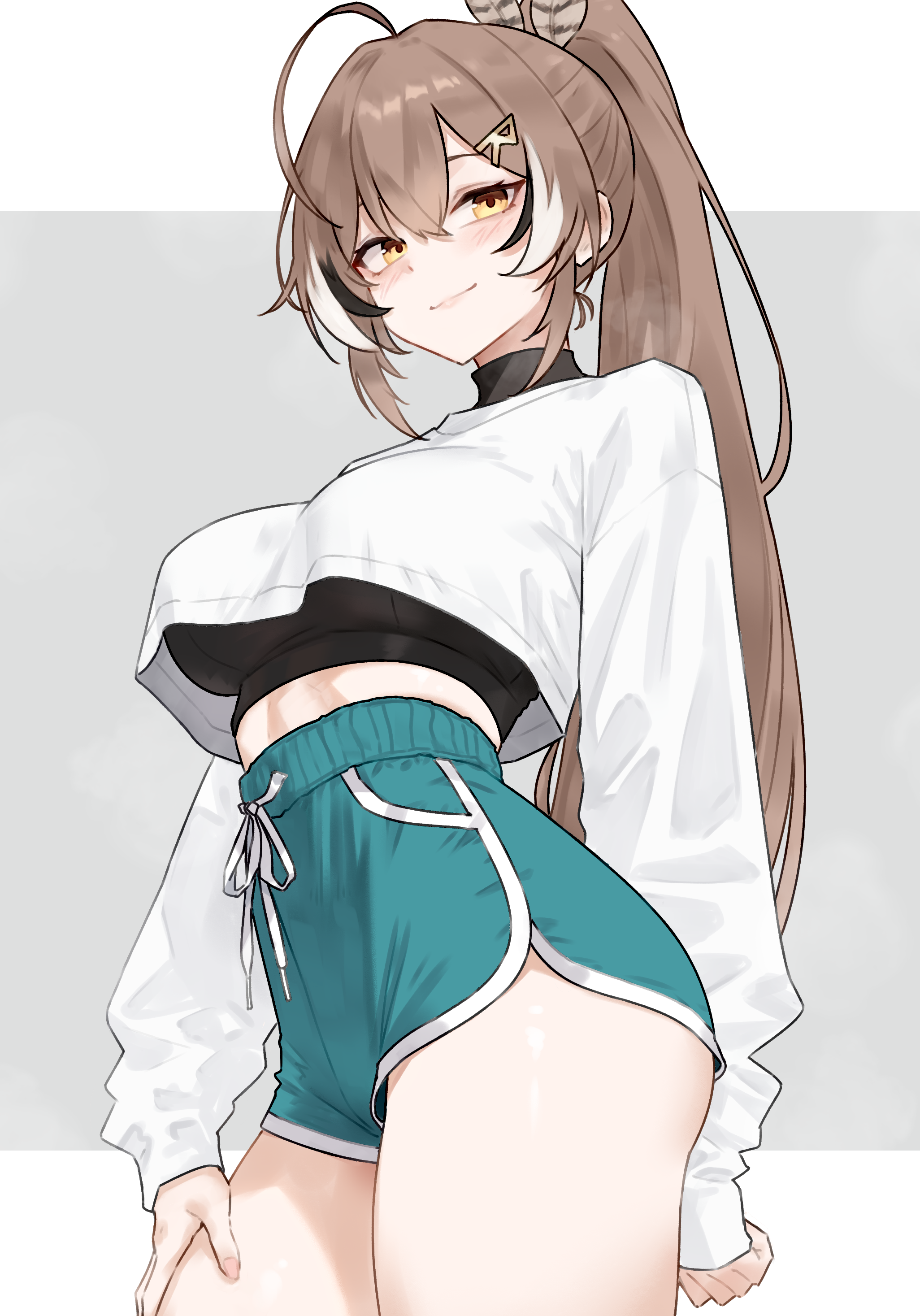 1girlahogealternate costumeblack hairblack sports brabreastsbrown eyesbrown haircovered underboobcowboy shotcrop topcrop top overhangdolphin shortsfeather hair ornamentfeathersgrey hairhair between eyeshair ornamenthaircliplarge breastslong hairlong sleeveslooking at viewermulticolored hairponytailshortssleeves past wristssmilesolosports brastreaked hairthighsvirtual youtuber