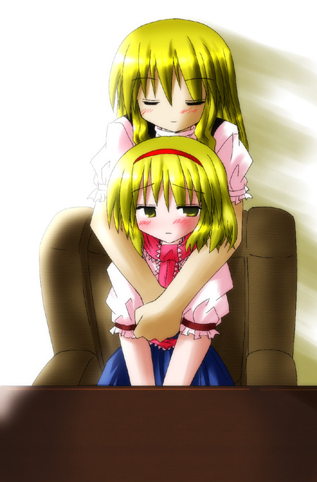 arcueid brunestud, len (tsukihime), tsukihime, looking away, 00s, 2girls, ahoge, blonde hair, blue background, border, bow, fur trim, hair bow, half updo, long sleeves, looking at viewer, multiple girls, parted bangs, pointy ears, pom pom (clothes), red eyes, sidelocks, simple background, smile, sweater, upper body, white border