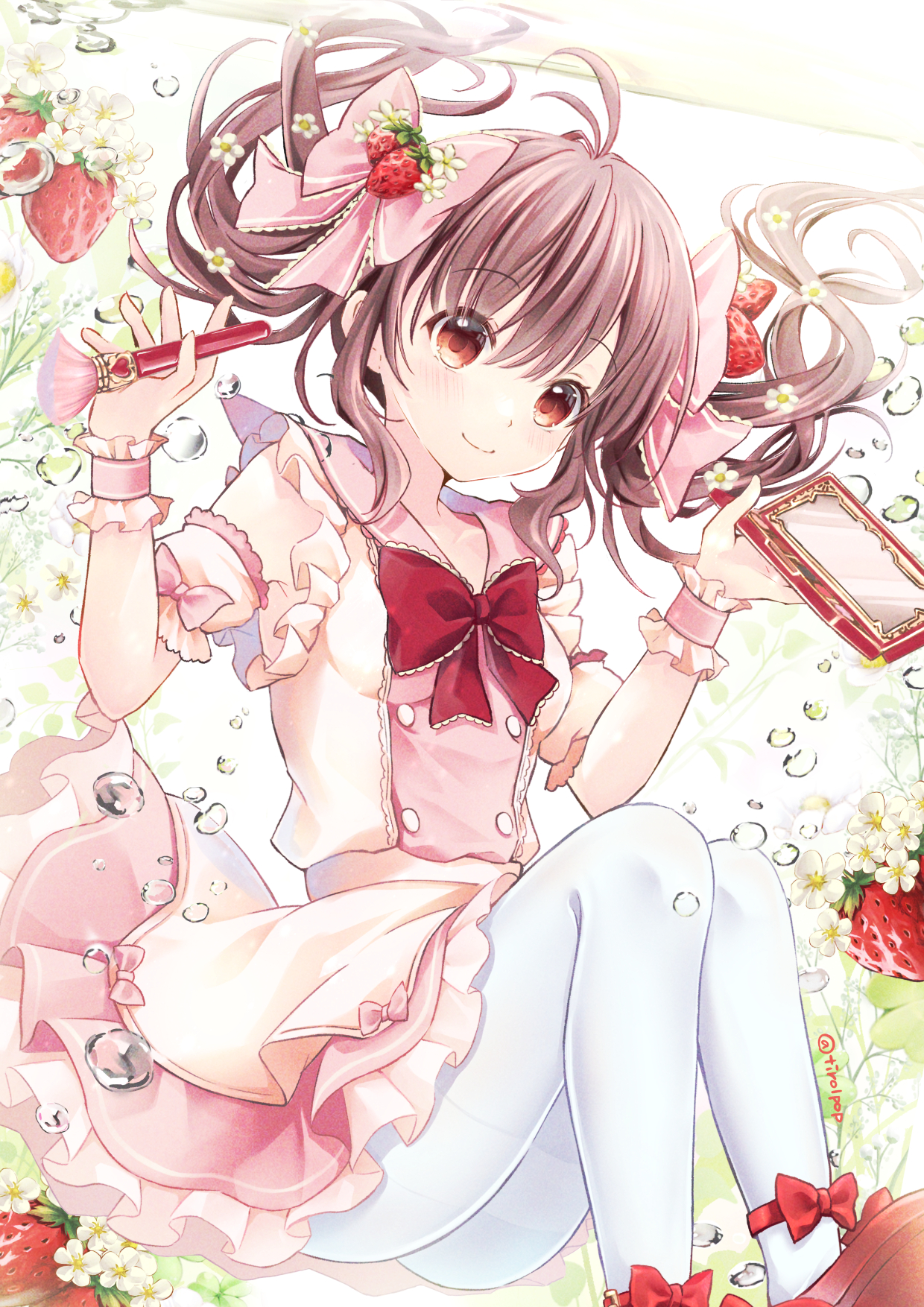 1girlantenna hairbare shouldersblushbowbowtiebrown hairclosed mouthdetached sleevesdressfeet out of framefoodfruithair bowholdingholding brushholding makeup brushmakeup brushpantyhosepink bowpink dresspink sleevesred bowred bowtiered eyesred shoesshoesshort hairshort sleevessmilesolostrawberrytwintailswhite pantyhosewrist cuffs