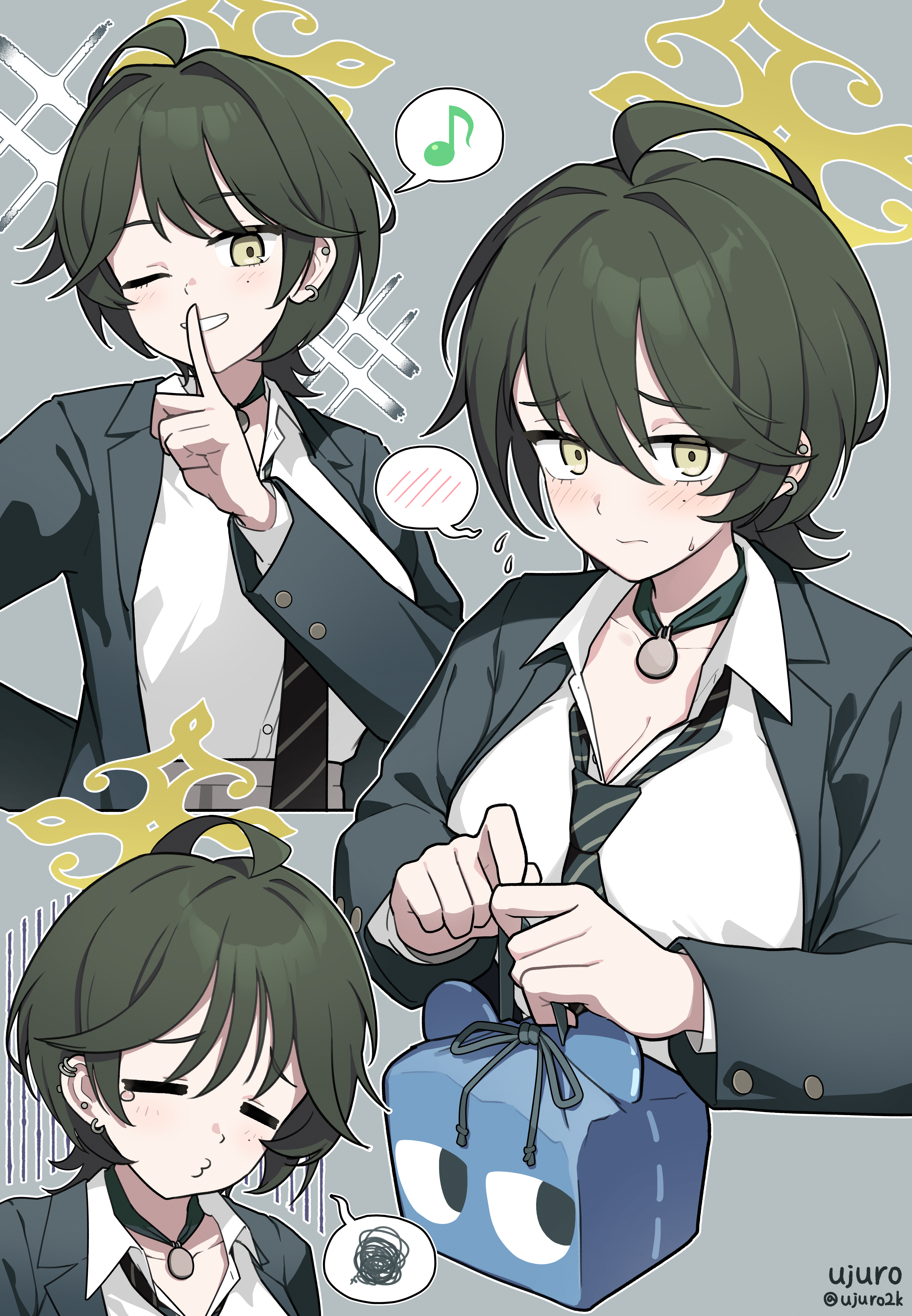 1girlahogeartist nameblack chokerblack jacketblushbreastsbrown eyeschokercleavageclosed eyesclosed mouthcollared shirtear piercingfinger to mouthfurrowed browgreen chokergreen hairgrey backgroundhaloholdingjacketlong sleeveslooking at viewermedium breastsmolemole under eyemultiple viewsmusical noteo3oone eye closedpiercingshirtshort hairshushingsmilesparklespoken blushspoken musical notespoken squigglesquigglesweattwitter usernamewhite shirt