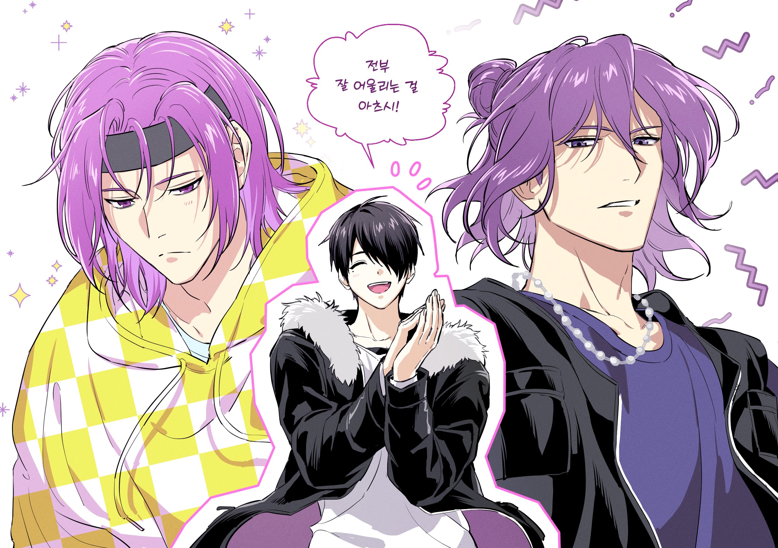 2boysblack hairblack headbandblack jacketblue shirtcheckered clothesclosed eyesclosed mouthcollarbonecrew neckdrawstringfingernailsfrownfur trimfur-trimmed jacketheadbandhoodhood downhoodiejacketjewelrykorean textlong sleeveslooking downmale focusmultiple boysmultiple viewsnecklaceopen clothesopen jacketopen mouthown hands togetherparted bangsparted lipspurple eyespurple hairshirtshort hairspeech bubbleteethunzippedupper bodywhite furwhite shirt
