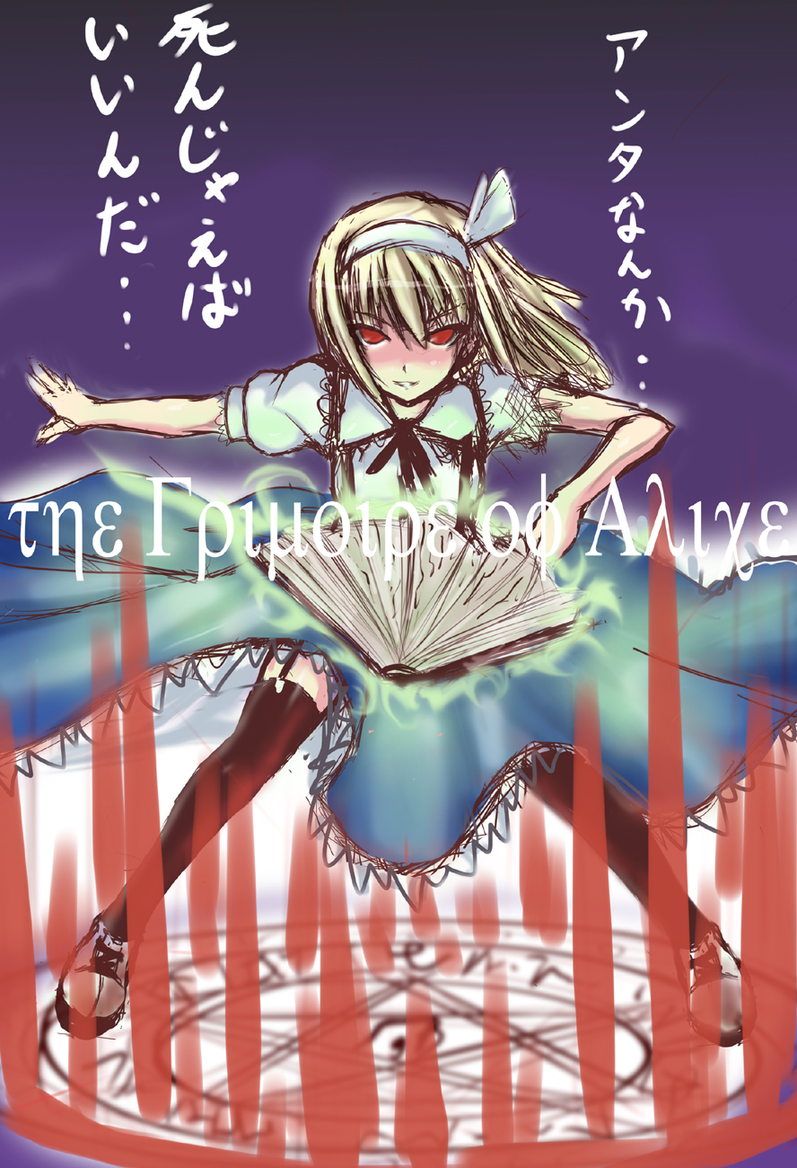 1girlblonde hairbookfemale focusgrimoiregrimoire of alicemagic circlepentagramribbonskirtsolothighhighs