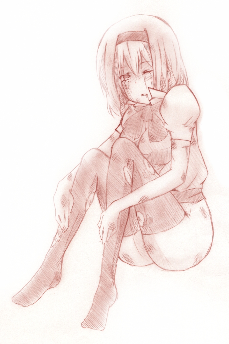 1girlbatteredblonde hairbloodbruisefeetfemale focusinjurymonochromepink themesketchsolotearsthighhighstorn clothes