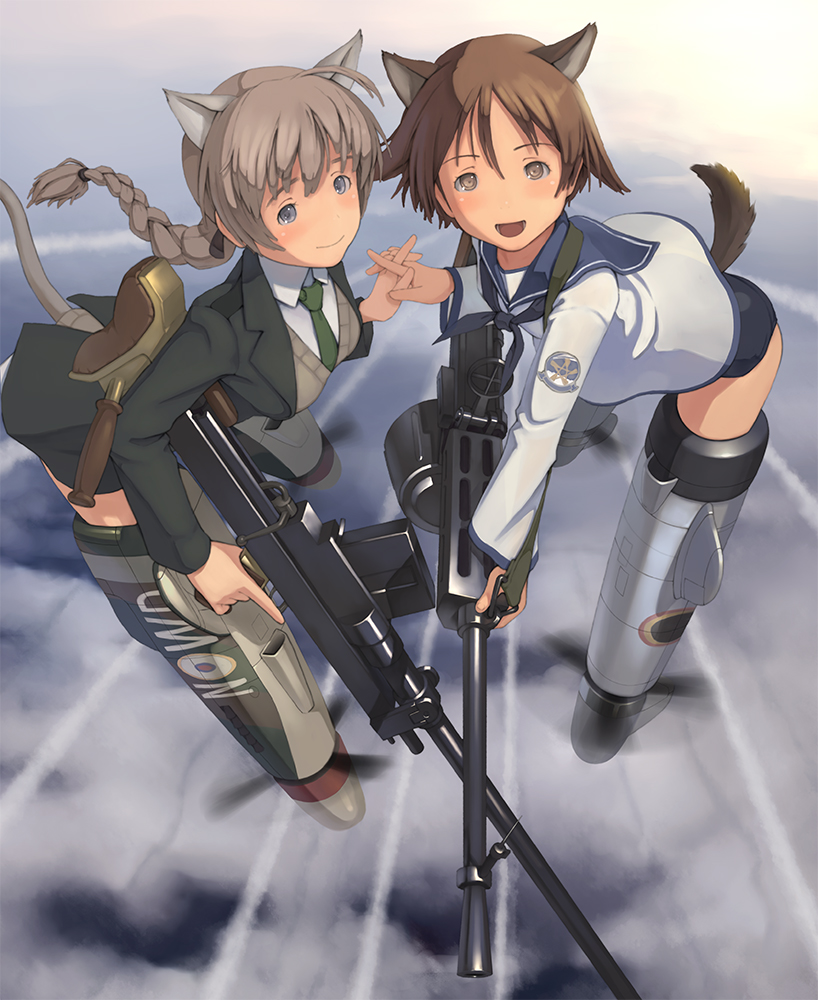 00s2girlsanimal earsanti-materiel rifleblousebraidcat earscat taildog earsdog taildrum magazinegunholding handsinterlocked fingersmagazine (weapon)multiple girlsopen mouthrifleshirtsingle braidsniper rifleswimsuitswimsuit under clothestailweaponwhite shirt