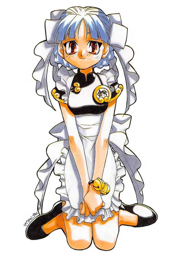 1990s (style)1girlbellblack shoesblonde hairbowchinese clothesfull bodyhair bowjingle bellkneelinglooking at viewerred eyesretro artstyleshoesshort sleevessimple backgroundsmilesolov armswhite background