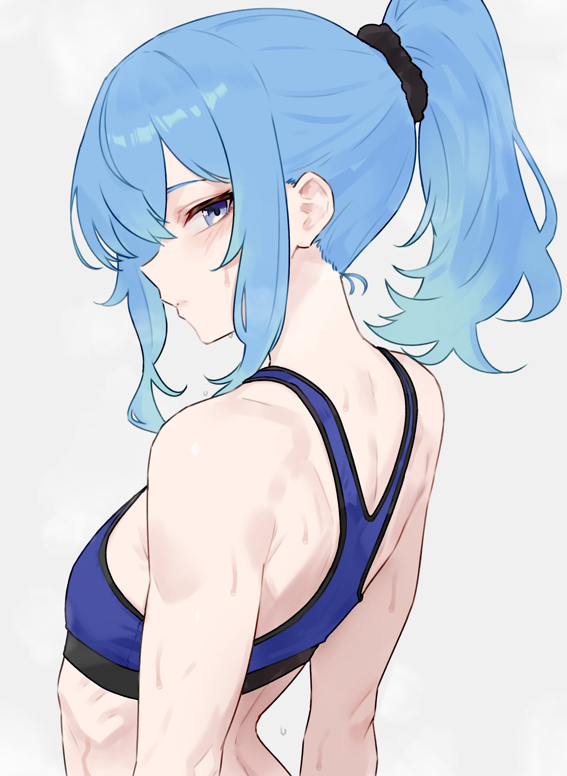 1girlalternate costumebackblue eyesblue hairblue sports braflat chesthigh ponytaillooking at viewerponytailsidelockssideways glancesimple backgroundsolosports brastar (symbol)star in eyesweatsymbol in eyeupper bodyvirtual youtuber