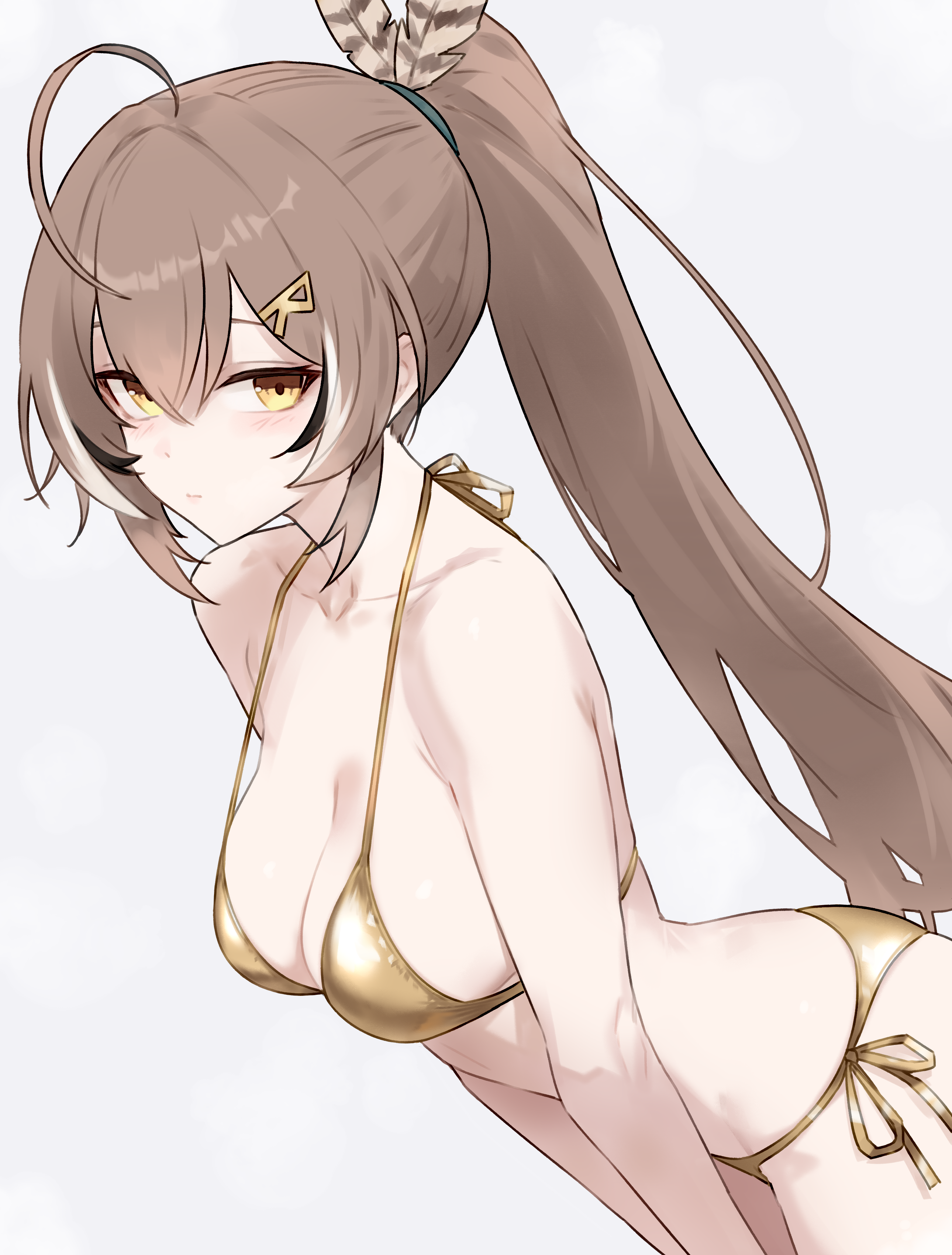 1girlahogealternate costumebikiniblack hairbreastsbrown eyesbrown haircleavagecrossed bangsdouble-parted bangsfeather hair ornamentfeathersgold bikinigolden weekhair between eyeshair ornamenthaircliphalterneckletter hair ornamentlong hairlooking at viewermedium breastsmulticolored hairponytailside-tie bikini bottomsideboobsimple backgroundsolostreaked hairstring bikiniswimsuitvery long hairvirtual youtuberwhite backgroundwhite hair