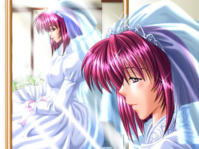 1girlbouquetbridal veilbridedressfemale focusflowermirrorpink eyespink hairsoloveilwedding dresswhite dress
