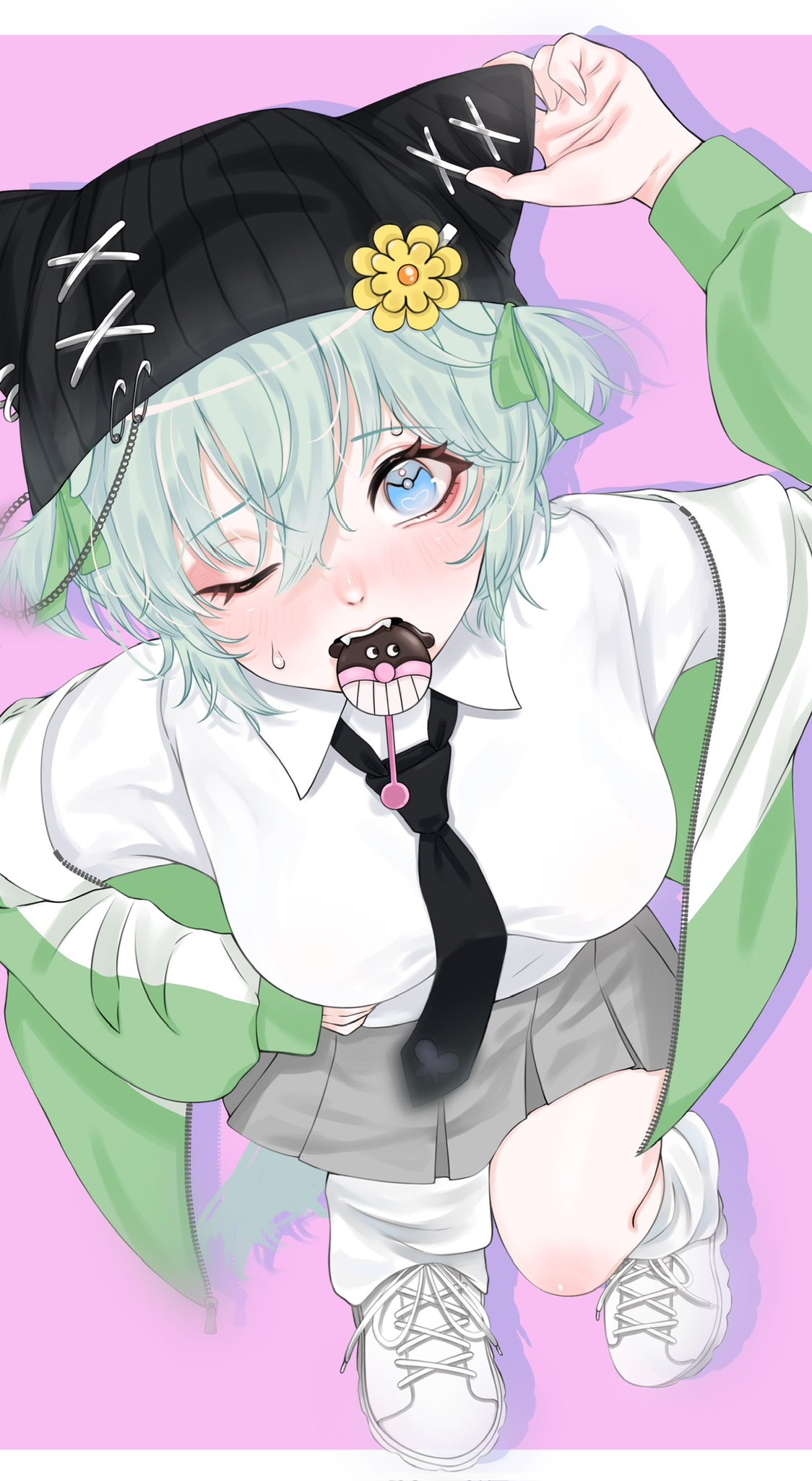 1girlanimal earsarm upblack necktieblue eyesblushbreastsfangsflowergreen jacketgreen ribbongreen skirtgrey hairhair flowerhair ornamenthair ribbonhaircliphand on own earhorse earshorse girljacketlarge breastslight blushlollipop in mouthlong sleevesnecktieone eye closedopen clothesopen jacketopen mouthpleated skirtribbonsafety pinshirtshoesshort hairskirtsolosweatdroptwo side upwhite shirtwhite shoesyellow flower