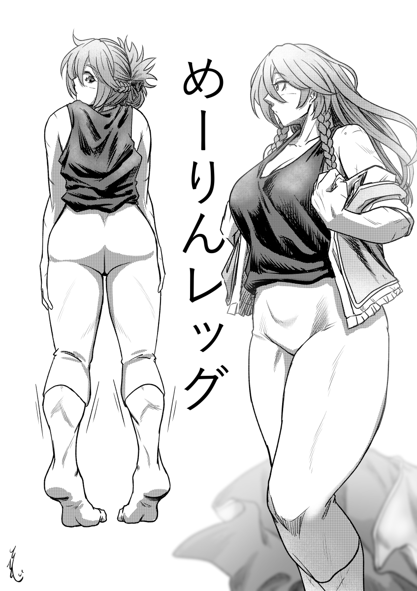 1girlassbare shouldersbarefootbraidbreastscleavagefrom behindfull bodygreyscalelarge breastslong hairlooking backlooking downmonochromemultiple scarsmultiple viewsno headwearoff shoulderpantsponytailprofilescartank toptiptoestwin braids