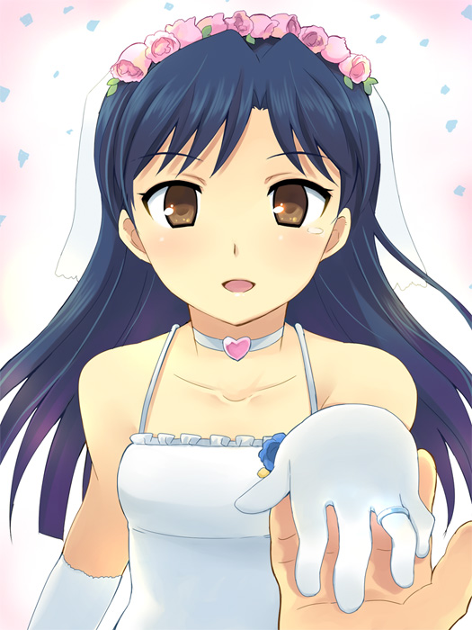 00s1girlbare shouldersblue hairblushbridal veilbridebrown eyeschokerdresselbow glovesflat chestflowerforeshorteninggloveshair flowerhair ornamentholding handsjewelrylong hairopen mouthpovringsolo focusveilwedding dress