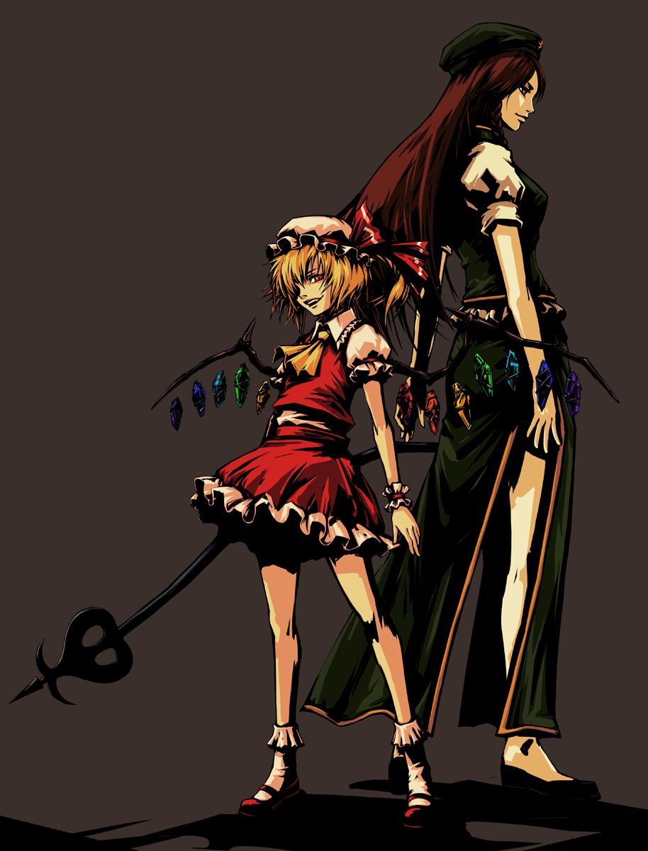 2girlsback-to-backblonde hairbraidchina dresschinese clothesdarkdressfemale focushathigh contrastlong hairmultiple girlsred eyesred hairshort hairsmilestaff