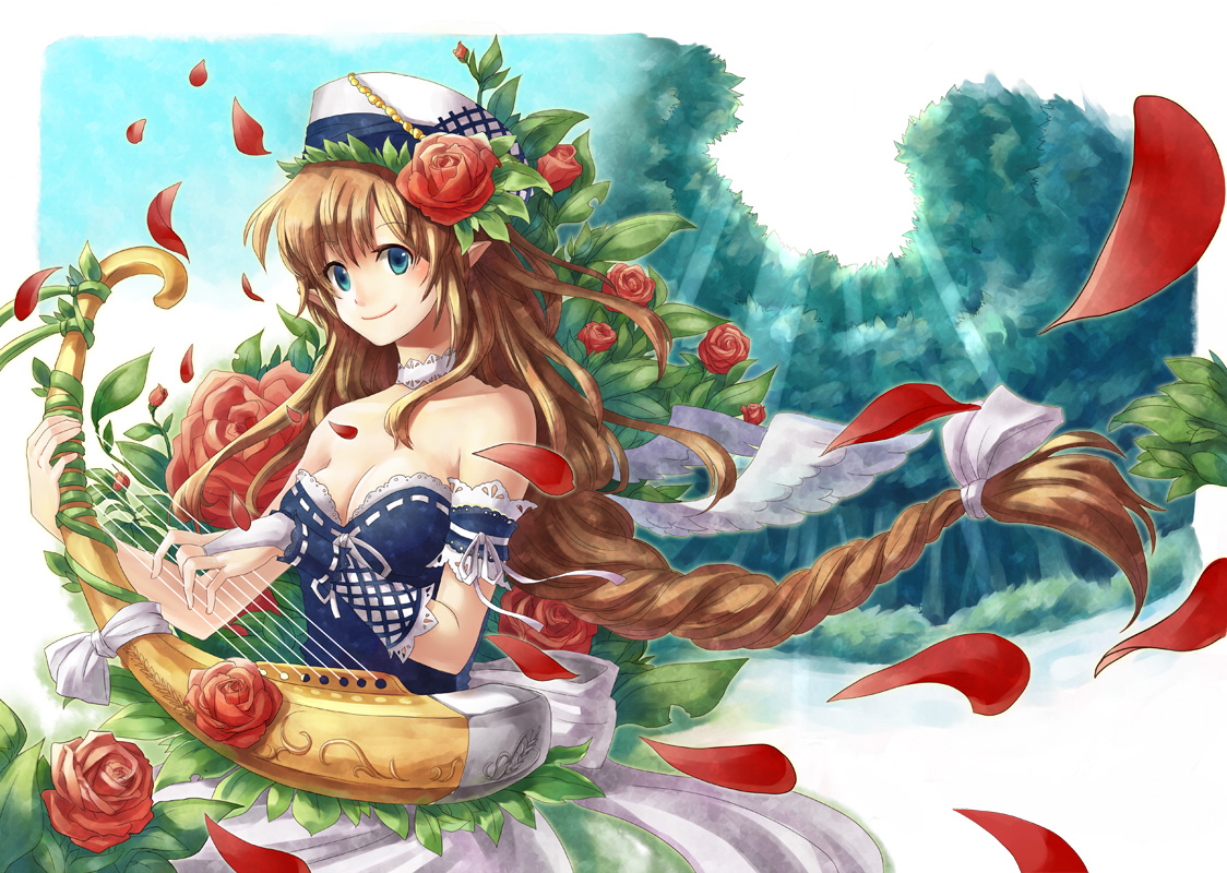 bare shouldersblue eyesbraidbrown hairchokerdresselfflowerharphatinstrumentlong hairpetalspointy earsribbonsingle braidsmilesolostraplessstrapless dressvery long hairwings