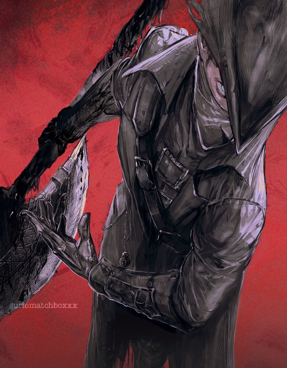 hightguy, hornet (hollow knight), hollow knight, hollow knight: silksong, chinese commentary, commentary request, highres, 1girl, arthropod girl, artist name, border, cloak, film grain, full body, grey background, halftone, halftone background, holding, holding needle, hollow eyes, horned mask, looking at viewer, mask, needle, needle (hollow knight), no mouth, red cloak, silk, simple background, solo, standing, white border, white mask