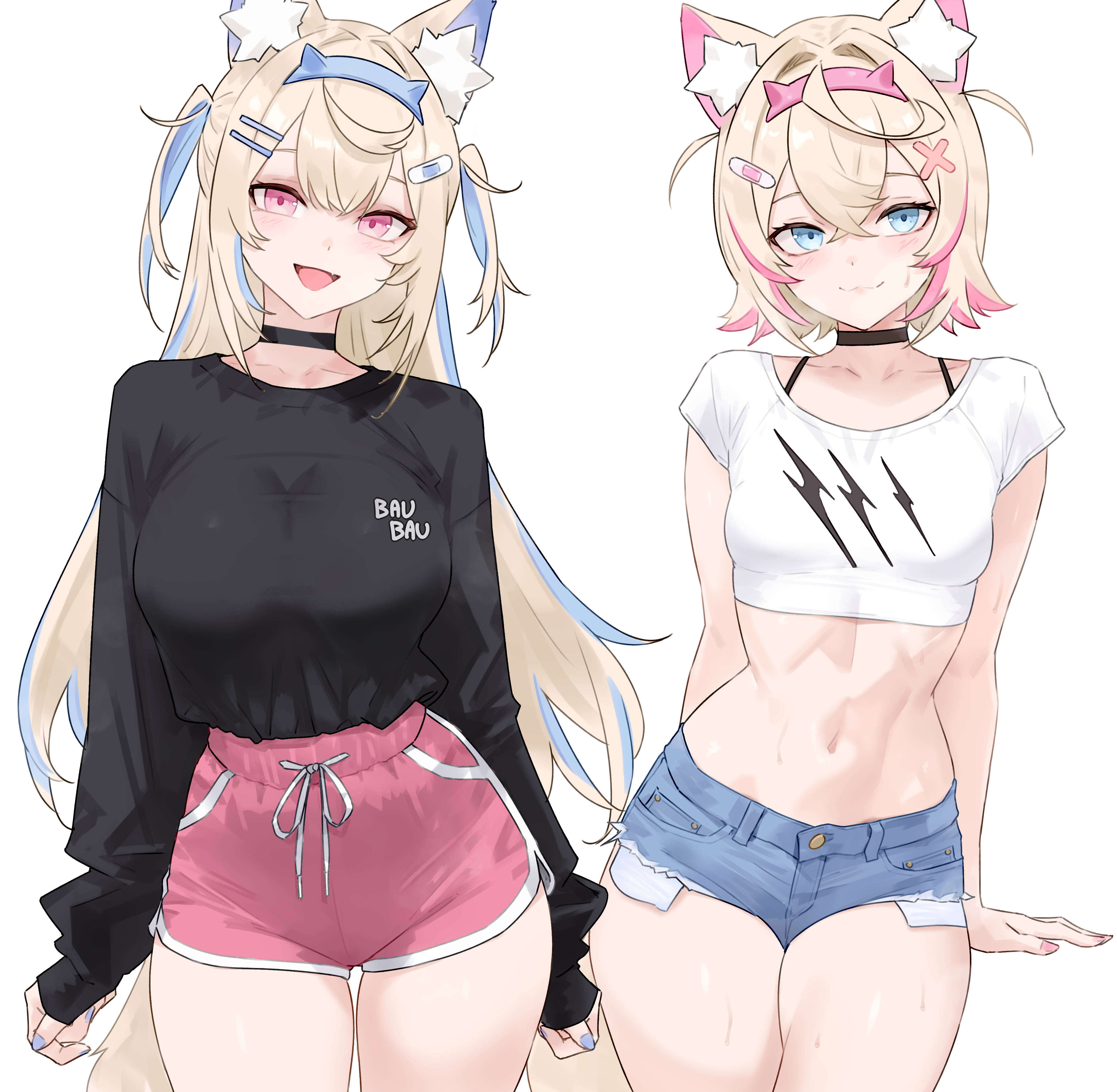 :3:d2girlsadapted costumealternate costumeanimal ear fluffanimal earsbandaidbandaid hair ornamentblack chokerblack shirtblonde hairblue eyesblue hairblue hairbandblue shortsbra strapbreastschokerclosed mouthcolored inner animal earscowboy shotcropped shirtcrossed bangscutoff jeanscutoffsdenimdenim shortsdog earsdog girldog taildolphin shortsdouble-parted bangsexposed pocketfake hornsfrayed shortshair between eyeshair intakeshair ornamenthairbandhaircliphorn hairbandhornslarge breastslong hairlong sleeveslooking at viewermidriffmulticolored hairmultiple girlsnail polishnavelopen mouthpink eyespink hairpink hairbandpink nailspink shortsshirtshirt tucked inshort hairshort shortsshort sleevesshortssiblingssimple backgroundsisterssleeves past wristssmall breastssmilestraight-onstreaked hairt-shirttailthigh gaptwinstwo side upvirtual youtuberwhite backgroundwhite shirtx hair ornament