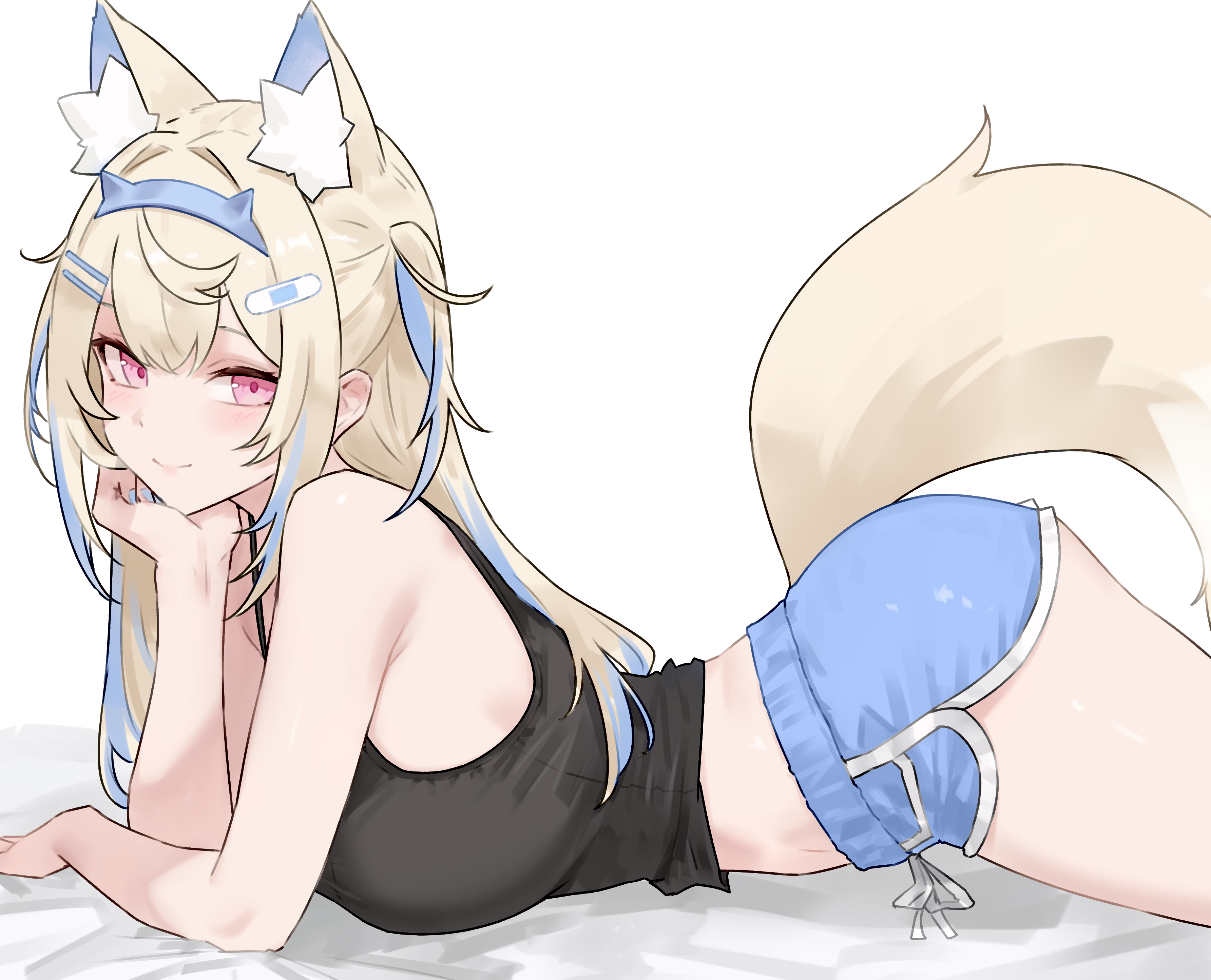 1girlalternate costumeanimal earsbandaidbandaid hair ornamentblack tank topblonde hairblue hairblue hairbandblue shortsbreastsclosed mouthcrossed bangsdog earsdog girldog taildolphin shortsdouble-parted bangsextra earsfake hornsfrom sidehair between eyeshair ornamenthairbandhaircliphand on own chinhead resthorn hairbandhornslarge breastslong hairlooking at viewerlyingmidriffmulticolored hairon stomachparallel hairclipspink eyesshort shortsshortssimple backgroundsmilesolostreaked hairtailtank toptwo side upvirtual youtuberwhite background