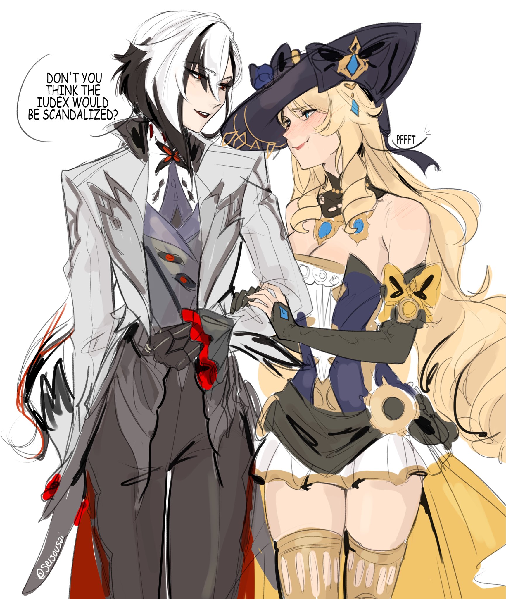 2girlsartist namebare shouldersblack bowblack chokerblack eyesblack glovesblack hairblack handsblack hatblack lipsblack pantsblonde hairblue eyesblushbowbreastscapechokercleavageclosed mouthcolored extremitiescowboy shotdressdrill hairelbow glovesenglish textfingerless glovesglovesgrey vesthair between eyeshalf-closed eyeshathat bowjacketjewelrylapelslong hairlooking at anotherlow ponytailmedium breastsmulticolored hairmultiple girlsmultiple ringsnecklaceopen clothesopen jacketpantspink lipsponytailred pupilsringshirtsimple backgroundsleevelesssleeveless dresssmilespeech bubblestandingstraplessstrapless dresssymbol-shaped pupilsteethtwo-tone hairvestwhite backgroundwhite dresswhite hairwhite jacketwhite shirtx-shaped pupilsyellow bowyellow capeyuri