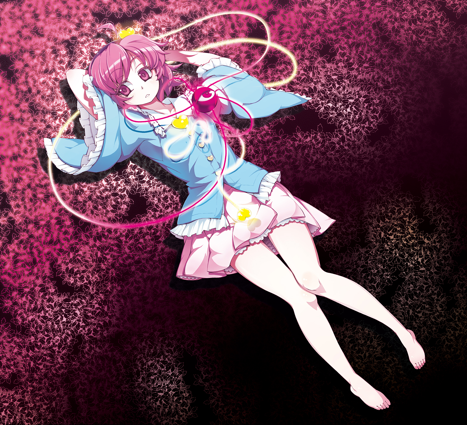 uruu gekka, hinanawi tenshi, touhou, highres, 1girl, blue hair, female focus, food, fruit, full body, hat, kaname-ishi, long hair, peach, ribbon, rope, shide, shimenawa, solo, sword, sword of hisou, weapon