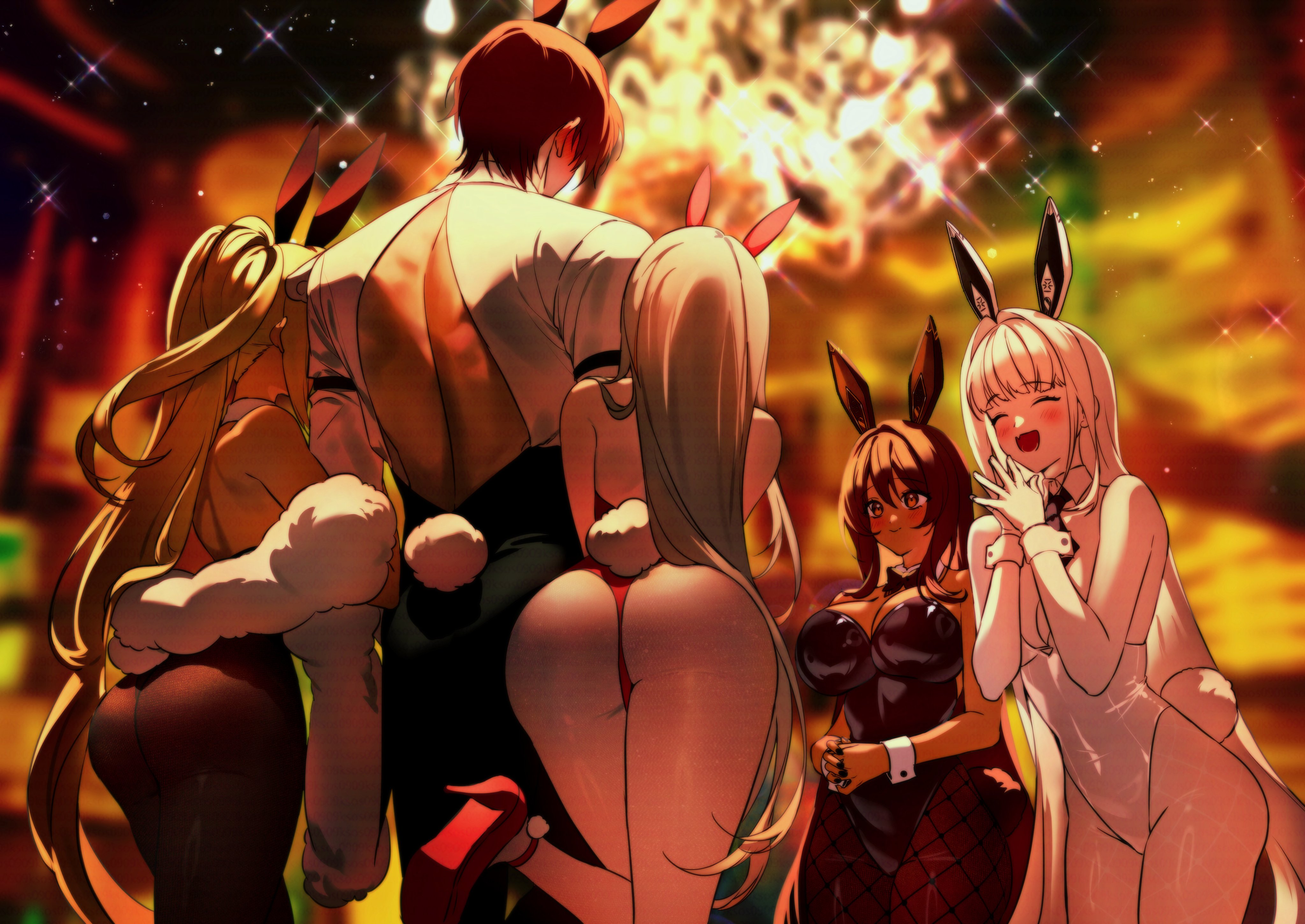 1boy4girlsanimal earsblack leotardbreastsbrown haircleavagedark skindark-skinned femaledetached collarfake animal earsfishnet pantyhosefishnetslarge breastsleotardlong hairmale playboy bunnymultiple girlspantyhoseplayboy bunnyrabbit earsrabbit tailtailvery long hairwhite hairwhite leotardwrist cuffsyellow eyes