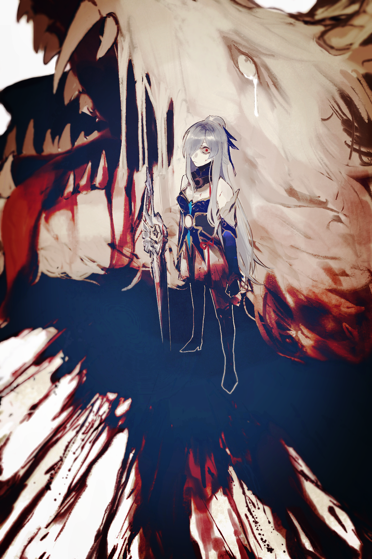 1girlblack bootsbloodblood splatterbootsdetached collardetached sleevesgiantgiant monsterhair over one eyelong hairlooking at viewermonsterone eye coveredopen mouthplantedplanted swordplanted weaponred eyessharp teethstandingswordtearsteeththigh bootsweaponwhite hairwide-eyed