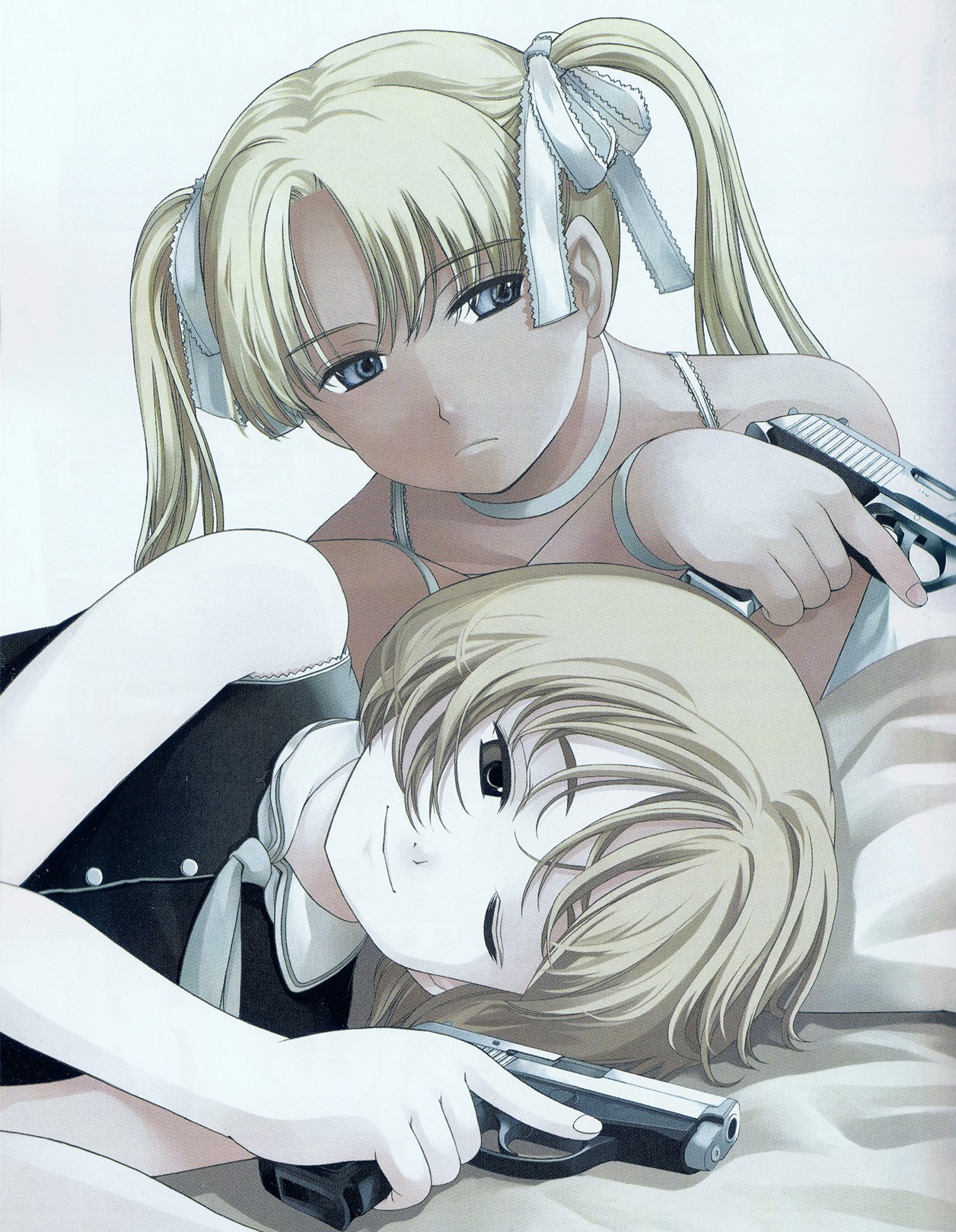 00s2girlsblonde hairblue eyesbob cutgunhandgunlong hairmultiple girlsone eye closedpistolshort hairtwintailsweaponwink