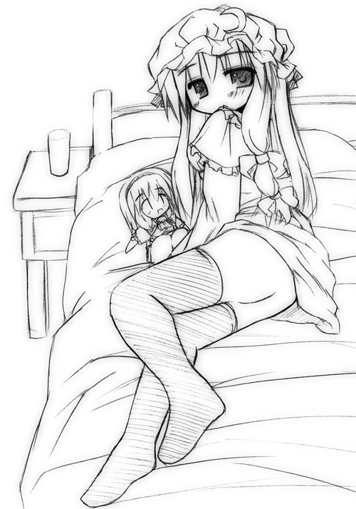 2girlsbedblushcharacter dollcrescentcrescent hat ornamentcrescent moondollfemale focusgreyscalehair ribbonhathat ornamentmonochromemoonmultiple girlsno pantiesribbonsolothighhighs