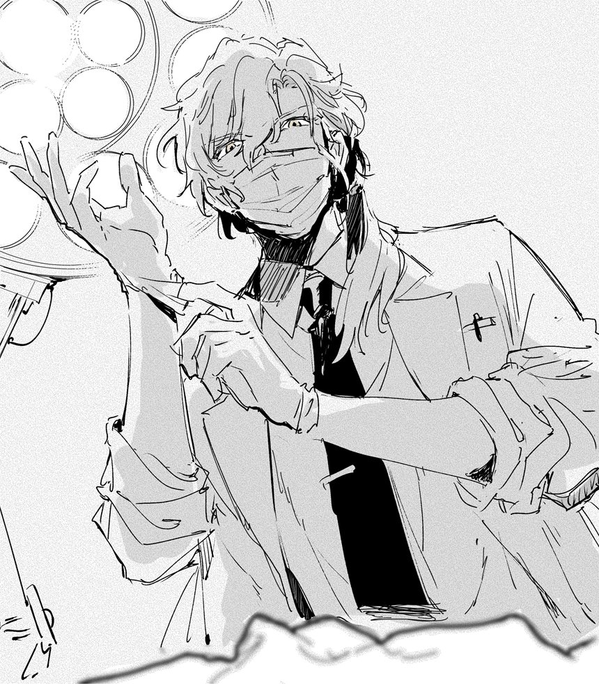 1boyalternate hairstyleblurrybreast pocketcollared shirtdepth of fieldfilm grainfrom belowglove pullglovesgrey backgroundhair between eyeshair over shoulderhands upjacketlooking at viewerlow ponytailmale focusmaskmedium hairmonochromemouth masknecktieobject in pocketopen clothesopen jacketparted bangspen in pocketpocketponytailshirtsleeves rolled upsolospot colorsurgical lightsurgical masktie clipyellow eyes