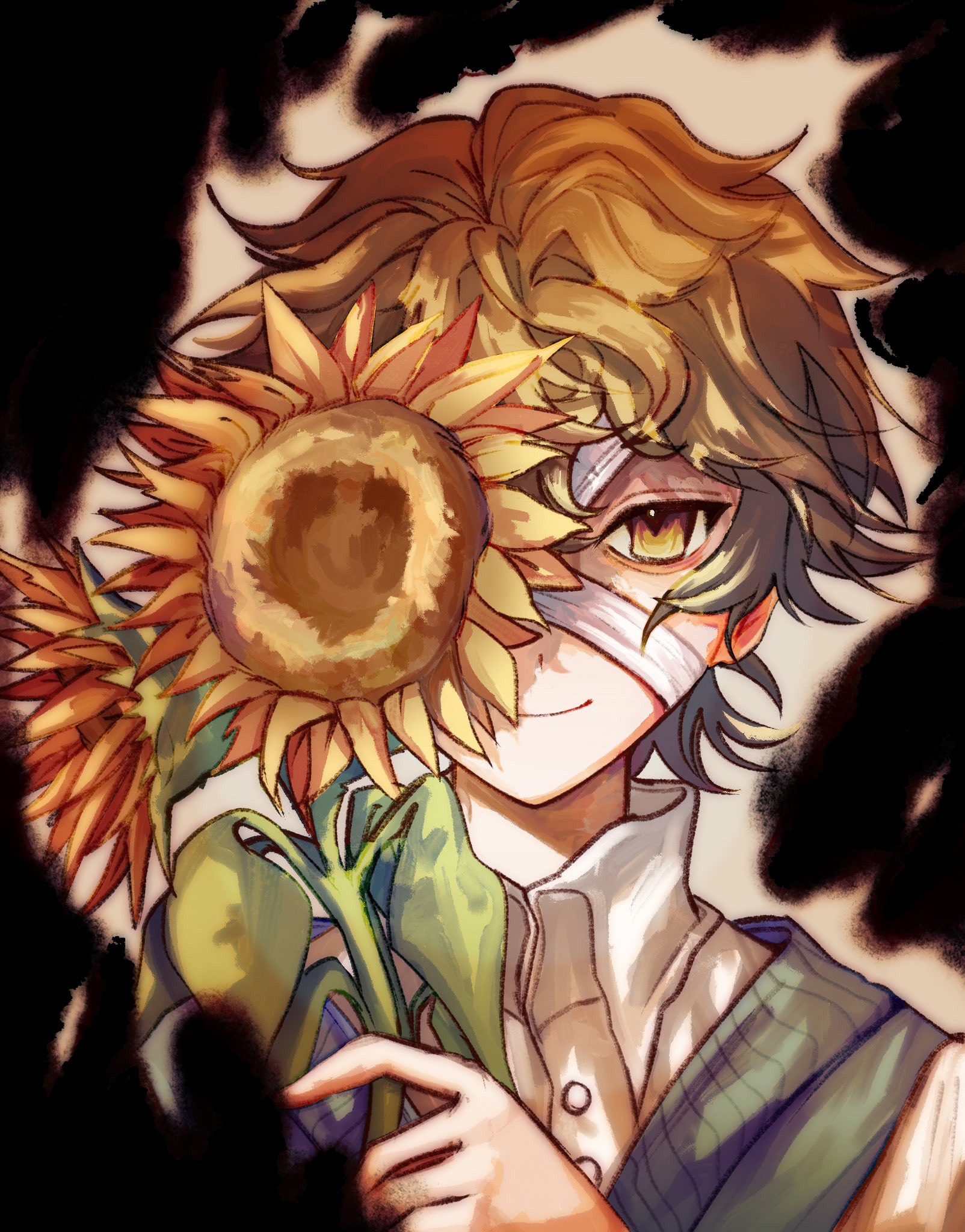 1boyaged downbandaged headbandagesblonde haircurly hairflowerflower over eyegreen sweater vestholdingholding flowerlooking at viewermale focusshirtshort hairsmilesunflowersweater vestwavy hairwhite shirtyellow eyesyichengsu1991