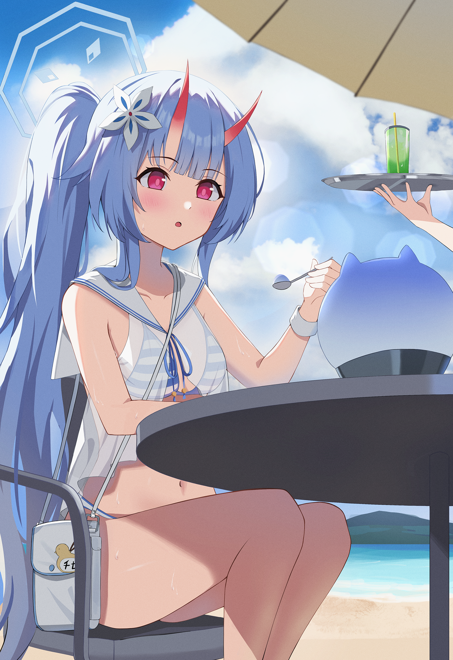 1girl1otherbagbeachbikiniblue bikiniblue hairblue haloblue skyblurryblushbokehcenter-flap bangsclouddepth of fielddrinkdrinking strawflowergradient hornshair flowerhair ornamenthaloholdingholding spoonholding trayhornslong hairlooking at viewermulticolored hornsname tagnavelpink eyesponytailsailor collarsandshoulder bagskin-covered hornsskyspoonstomachstriped bikinistriped clothesswimsuittrayvery long hairwaterwhite bagwhite bikiniwhite sailor collar