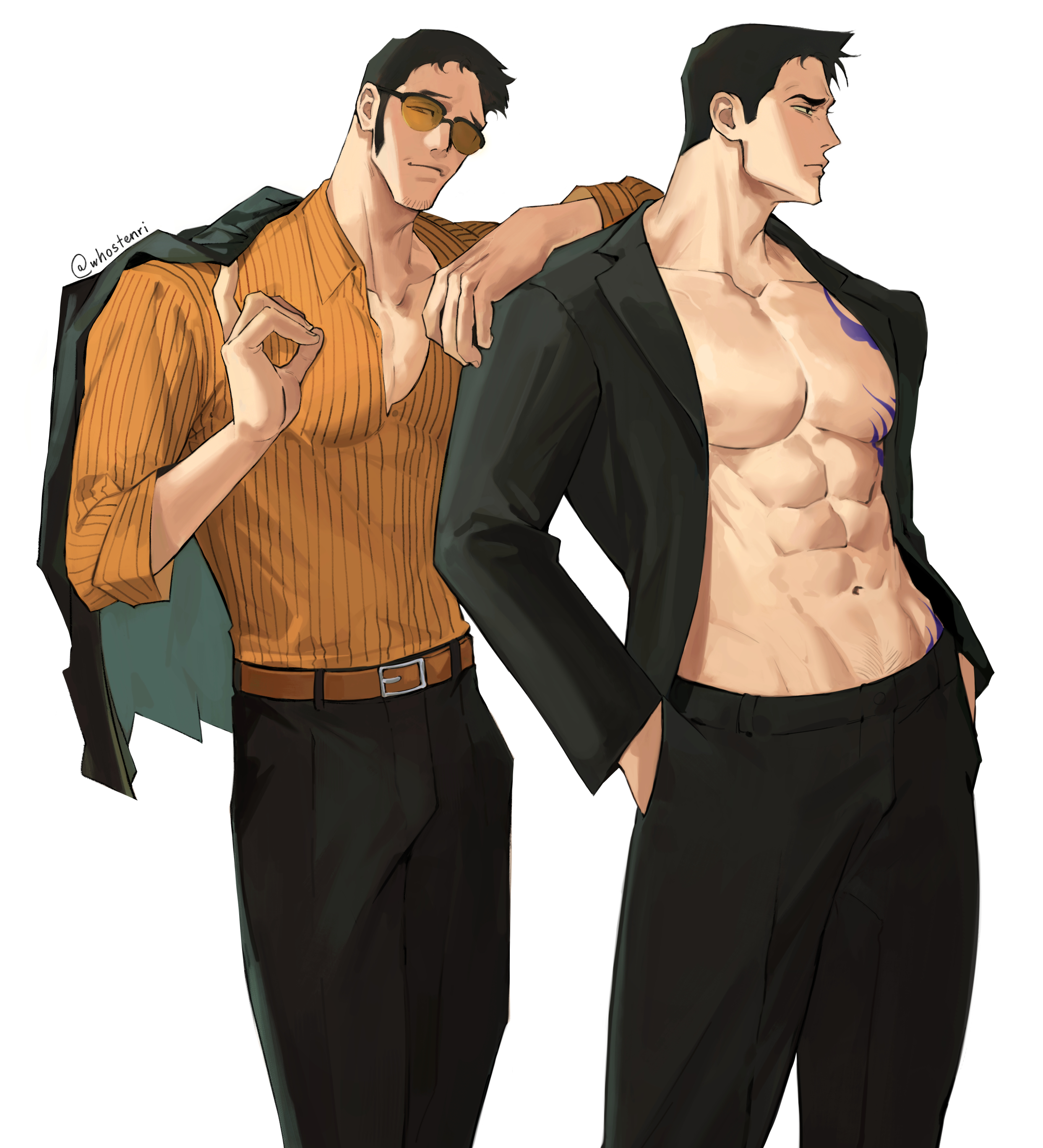 2boysabsaged downarms upbare pectoralsbeltbelt buckleblack hairblack pantsblack shirtbrown beltbuckleclosed mouthcollarbonecollared shirtelbow on another's shouldereyes visible through eyewearglasseshands in pocketsholdingholding unworn clothesholding unworn jacketjacketjacket over shoulderlapelslooking at viewermale focusmedium sideburnsmultiple boysnavelnipplesnotched lapelsopen clothesopen collaropen shirtpantspectoralsshirtshort hairtattootinted eyewearunworn jacketyellow shirtyellow-tinted eyewear