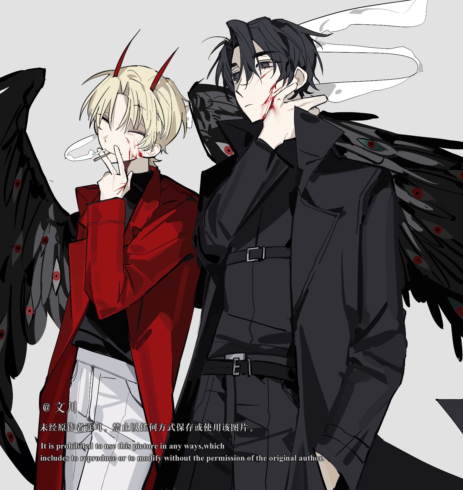 2boysblack coatblack eyesblack hairblack shirtblack wingsblonde hairbloodblood on faceblood on handscheon inhocigaretteclosed eyescoatcowboy shotcrew neckcurtained hairdemon hornsfeathered wingshand in pockethead tiltholdingholding cigarettehornsmale focusmultiple boysnicayukoopen clothesopen coatred coatred eyesshirtshort hairsmilesmokingtoo many eyesunamusedwalkingwingswiping blood