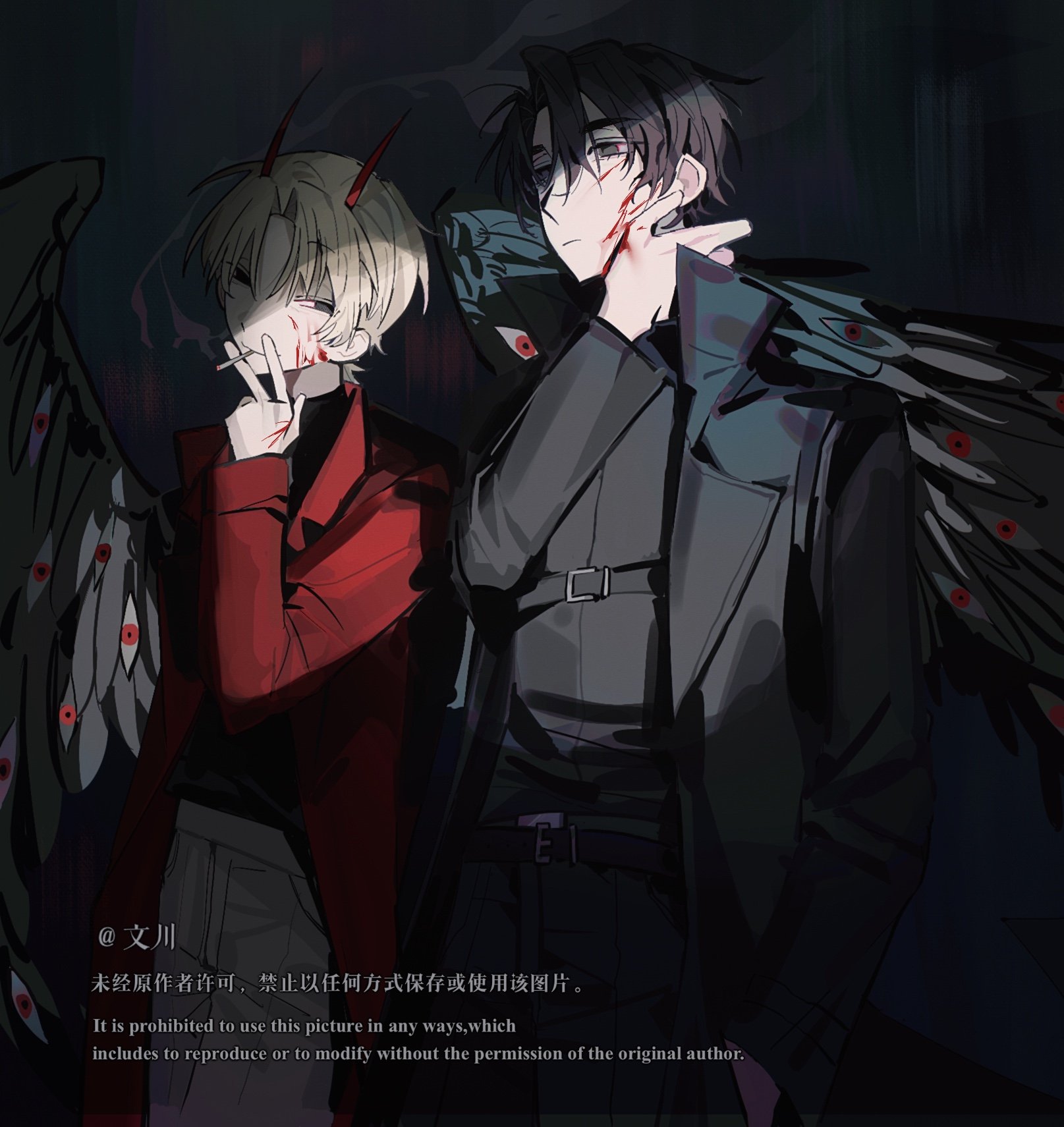 2boysblack coatblack eyesblack hairblack shirtblack wingsblonde hairbloodblood on faceblood on handscheon inhocigaretteclosed eyescoatcowboy shotcrack of lightcrew neckcurtained hairdarkdemon hornsfeathered wingshand in pockethead tiltholdingholding cigarettehornsmale focusmultiple boysnicayukoopen clothesopen coatpartially shaded facered coatred eyesshirtshort hairsmilesmokingtoo many eyesunamusedwalkingwingswiping blood