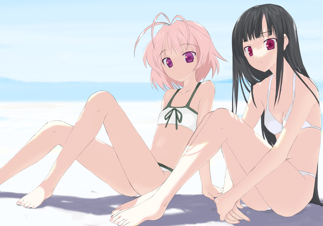 10s2girlsbarefootbeachbikiniblack hairdayfeetflat chestlegslong legsmultiple girlsnail polishoutdoorspink hairpurple eyesred eyessittingswimsuittoenail polishtoenails