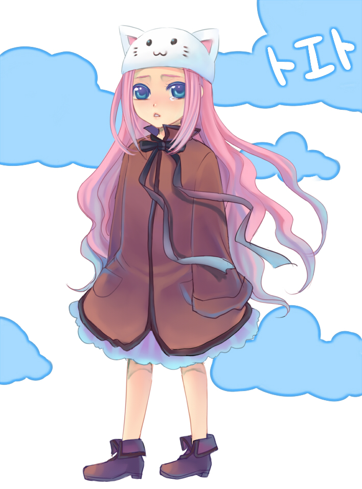 1girlanimal hatblue eyescat hatcoatfemale focushatlong hairpink hairpocketshoessolotearsvery long hair