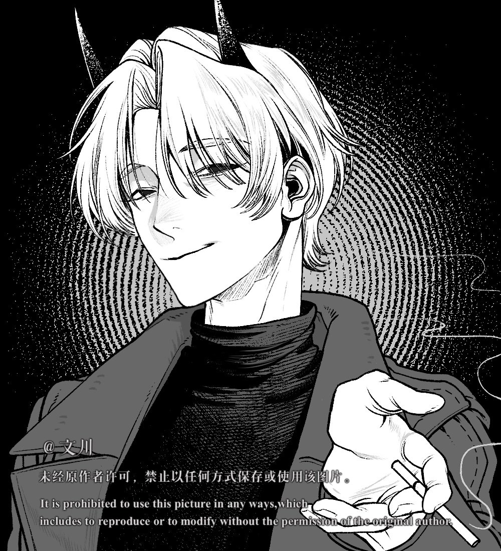 1boyabstract backgroundblack eyesblack shirtcigarettecoatcrew neckcurtained hairdemon hornsdouble-parted bangsgrey coatgreyscalehair over one eyehalf-closed eyeshead tiltholdingholding cigarettehornslooking at viewermale focusmonochromenicayukoopen clothesopen coatpopped collarshirtshort hairsmirksmokesmoke trailsoloswirlupper bodywhite hair