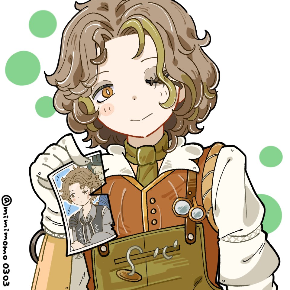 1boyapronascotblushbrown eyesbrown hairglovesgreen aprongreen ascotgreen streakshead tiltholdingholding photolooking at viewermale focusmimimomo0303multicolored hairone eye closedphoto (object)shirtstitched eyestreaked hairtwitter usernametwo-tone hairwavy hairwhite gloveswhite shirt