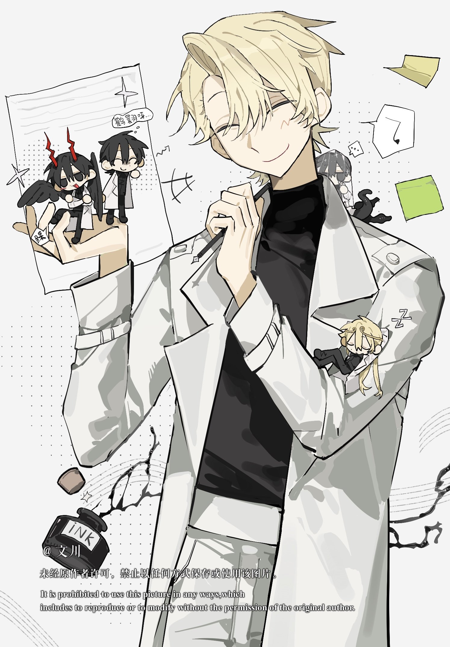 5boysblack shirtblonde hairborrowed clotheschinese textclosed eyescoatcorkcowboy shotcrew neckcurtained hairhair between eyeshead tiltholdingholding peninkwelllee hakhyunmale focusmini personminiboymultiple boysmultiple personamusical notenicayukoofficial alternate costumeopen clothesopen coatpenshirtshort hairsmilespillspoken musical notespoken zzzsticky notewhite coatzzz