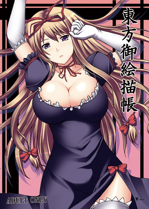 1girlarms upblonde hairbowbreastschokercleavagecollarbonecovercurvydresselbow glovesfemale focusgloveshair bowhair intakeshair ribbonhead tilthip focushuge breastslong hairlooking at viewerpurple dressribbonribbon chokerside slitsolostraight hairthighhighsthighswhite gloveszettai ryouiki
