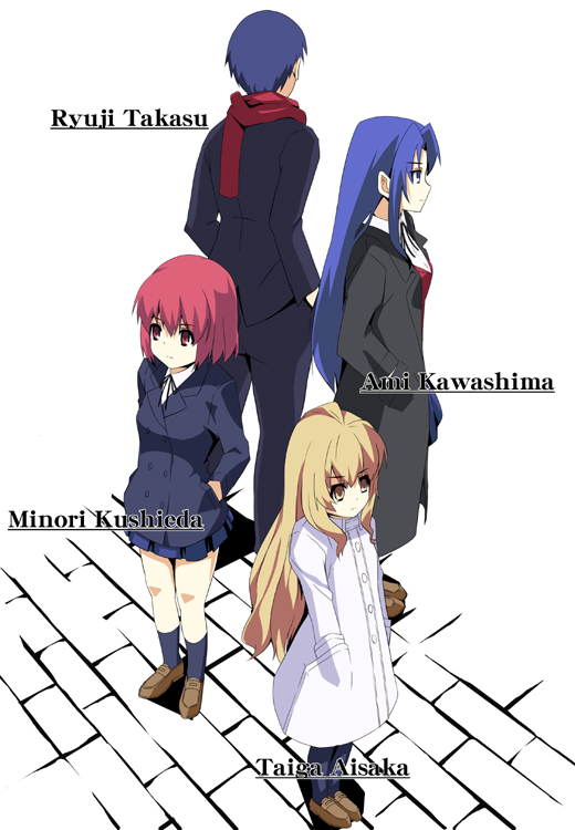 auge (akd), ryuko (oggyoggy), m.u.g.e.n, original, character request, commentary, highres, 2girls, blue eyes, breasts, fingerless gloves, gloves, long hair, multiple girls, neckerchief, ponytail, school uniform, serafuku, simple background, torn clothes, white background, yellow neckerchief