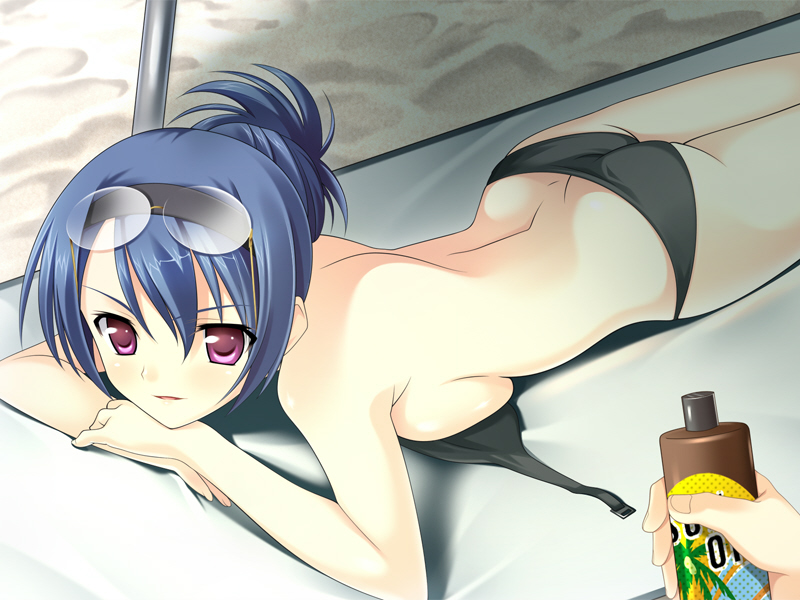 1girlbikiniblack bikiniblue hairfemale focusglasseslong hairlotionlyingon stomachpovpurple eyessandsolosunbathingsunscreenswimsuit