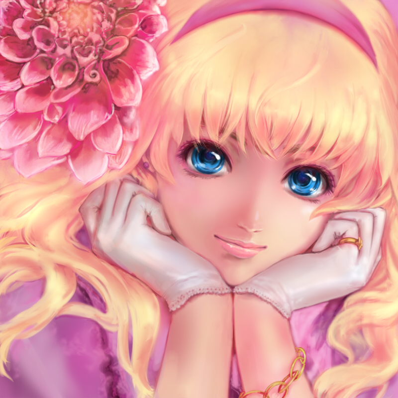 00s1girlblonde hairblue eyesfemale focusflowergloveshairbandhands on own facejewelrylooking at viewerringsolo