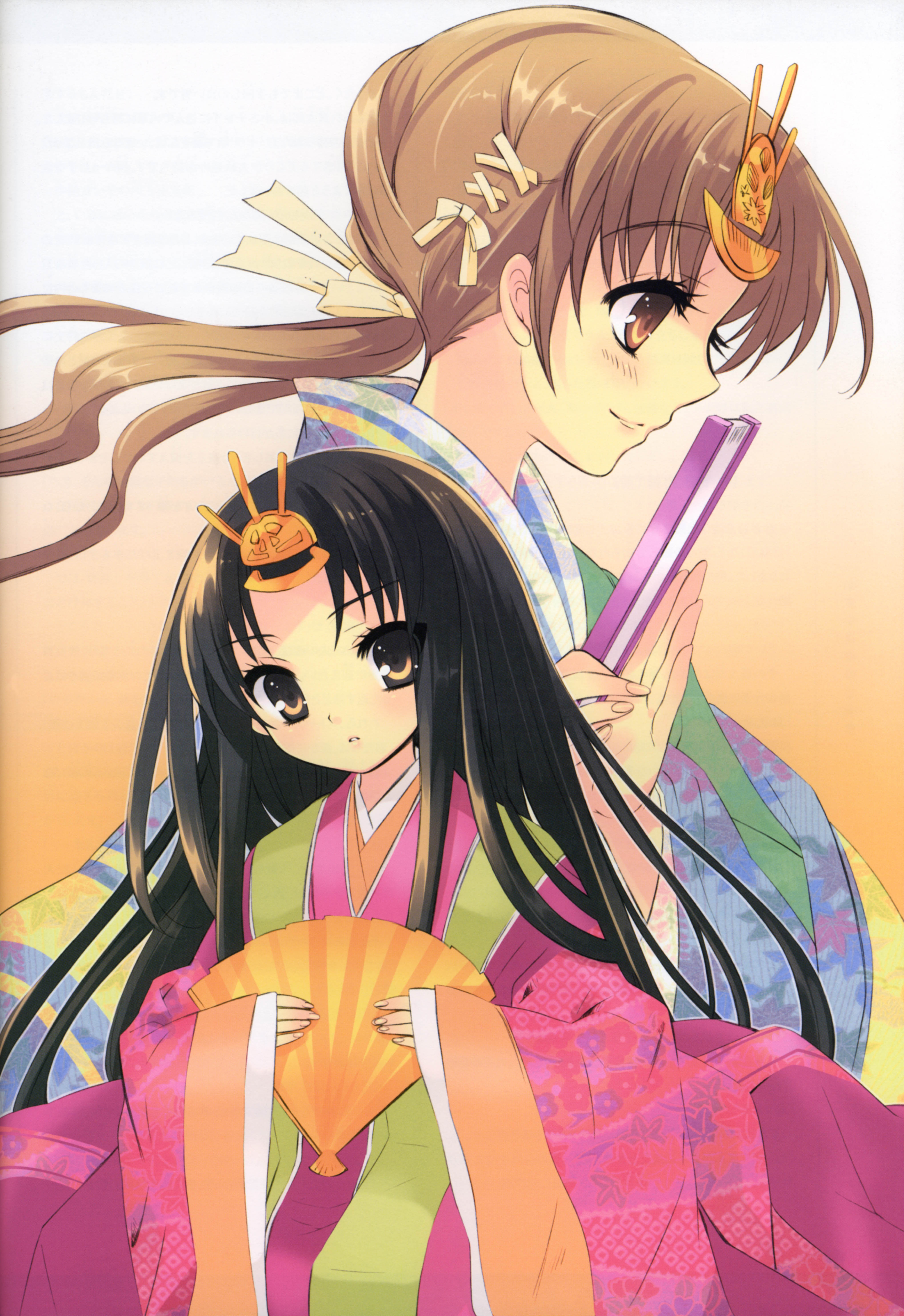 00s2girlsblack hairblushbrown eyesbrown hairhand fanjapanese clotheslong hairmultiple girlsribbonsmile