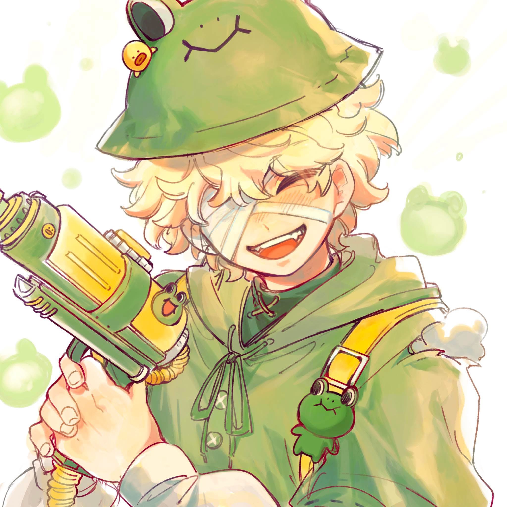 1boybandage over one eyeblonde hairblushbucket hatcucukhumnumzlcurly hairfacing viewerfangsfrog hatgreen hoodiegrinhatholdingholding water gunhoodhoodielayered sleeveslong sleevesmale focusofficial alternate costumeone eye closedshort over long sleevesshort sleevessmilewater gun