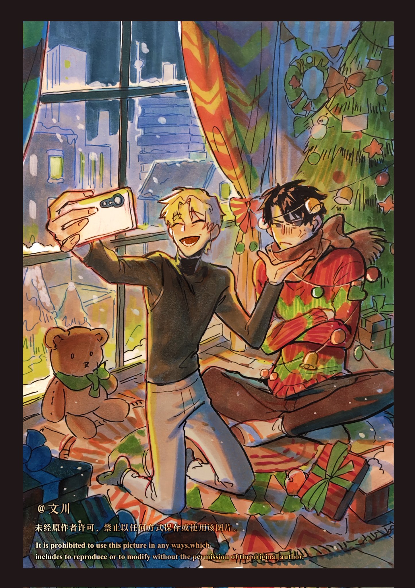 1boy2boysblack eyesblack hairblack shirtblonde hairboxcheon inhochristmaschristmas sweaterchristmas treecitycrew neckcrossed armscurtained haircurtainsfull bodygiftgift boxgrinholdingholding phoneimplied yaoiindoorskneelinglight particlesmale focusmultiple boysnicayukoon groundphonered scarfribbonrugscarfselfieshirtshort hairsmilesnowstuffed animalstuffed toytaking pictureteddy bearwindow lightwreath