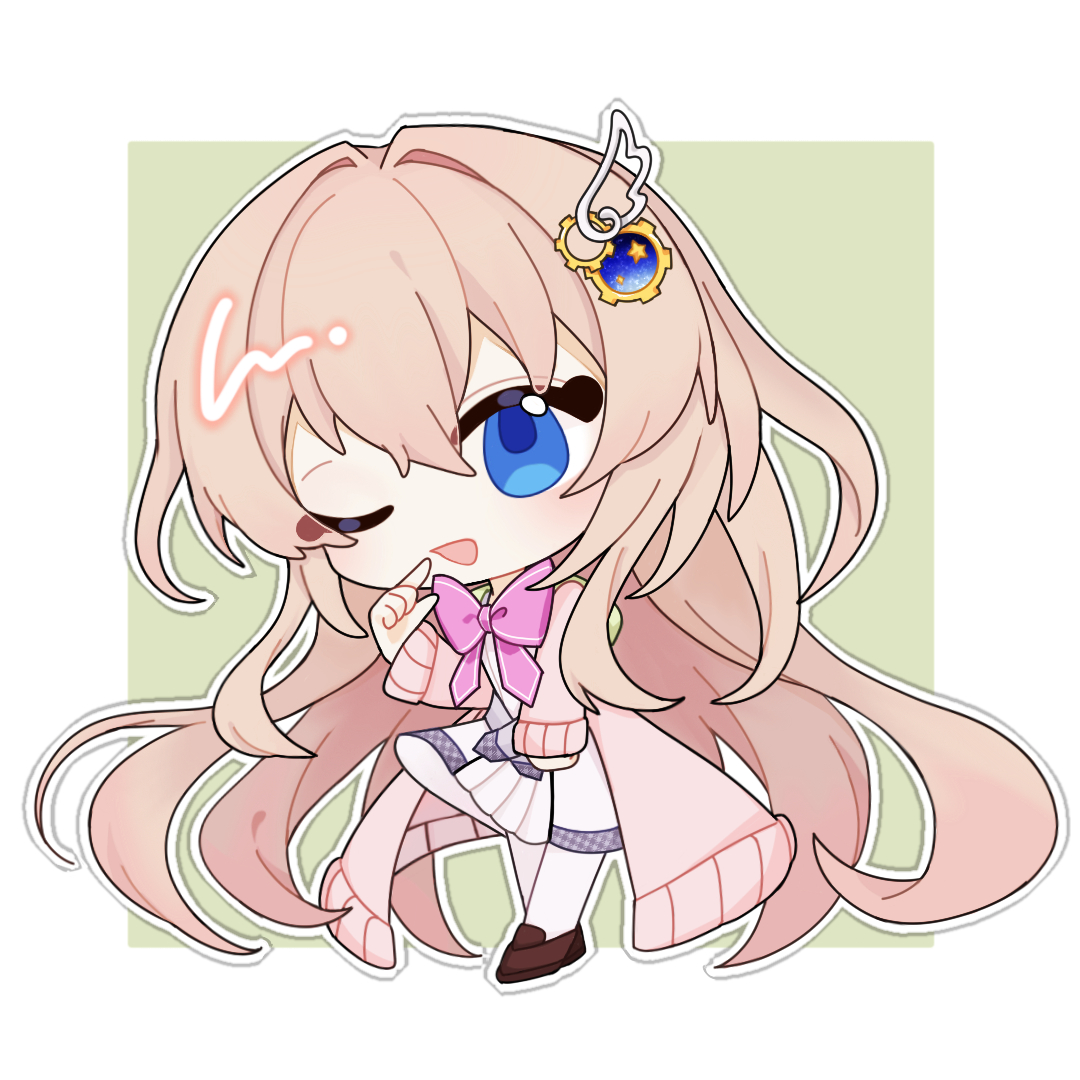 :d1girlabsurdly long hairblue eyesblushborderbowbowtiebrown hairbrown shoescardiganchibichibi onlydressfull bodygear hair ornamentgreen backgroundhair between eyeshair intakeshair ornamenthakusen academy school uniformhand upindex finger raisedloaferslong hairlong sleeveslooking at viewerone eye closedopen cardiganopen clothesopen mouthoutlineoutside borderpink bowpink bowtiepink cardiganpleated dressschool uniformshoessidelockssimple backgroundsmilesolostandingstar (symbol)star printthighhighsuser vzpm3225very long hairwhite borderwhite dresswhite outlinewhite thighhighswing hair ornament