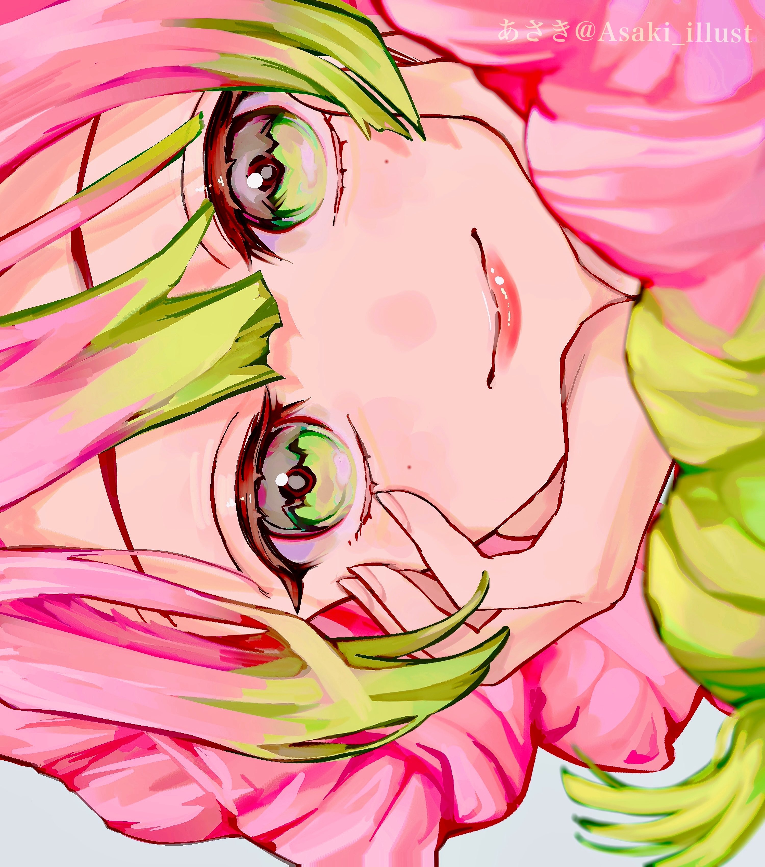 1girlbraidgradient hairgreen eyesgreen hairmolemole under each eyemole under eyemulticolored hairmultiple molespink hairsolotri braidsupper body
