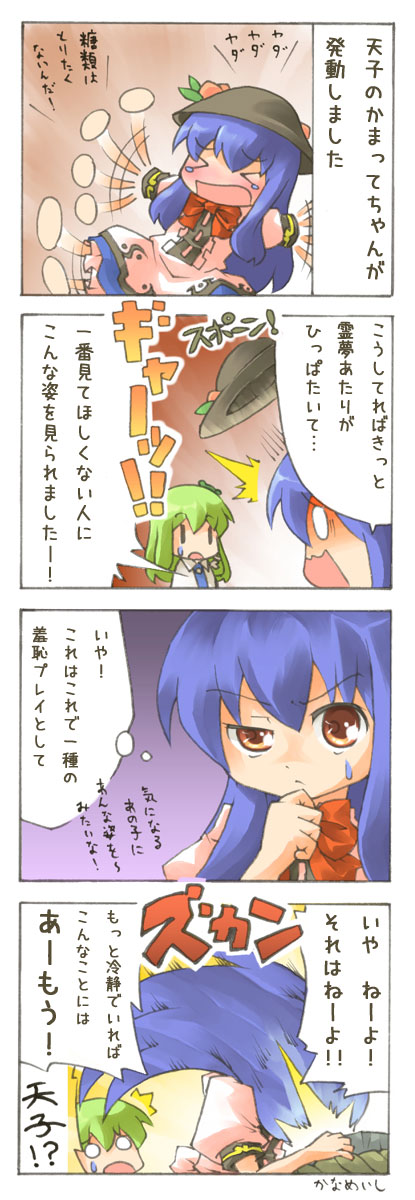 1boy2girls4komablue hairclosed eyescomicfemale focusfoodfruitgreen hairhatmultiple girlspeachred eyestantrum