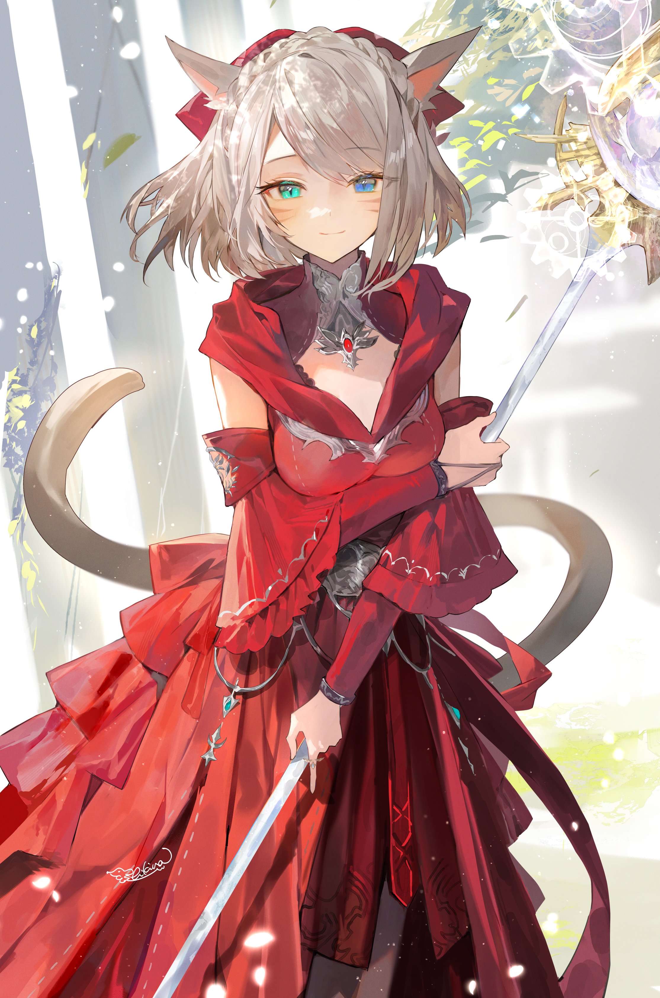 1girlanimal earsaqua eyesblue eyesbowbreastsbrown haircat earscat girlcat taildetached sleevesdressfacial markhair bowheterochromiaholdingholding stafflooking at viewermedium hairmiqo'tered dresssignaturesolostafftailwhisker markings